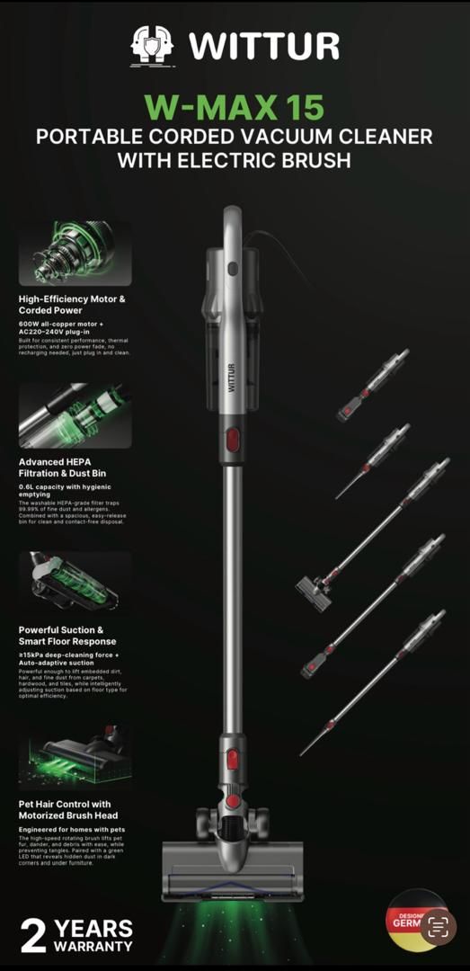 ۲۱۵ کیلوپاسکال نیروی تمیزکننده عمیق مکش را به صورت خودکار تنظیم می‌کند تا با فرش، زمین یا فرش، گرد و غبار و … مطابقت داشته